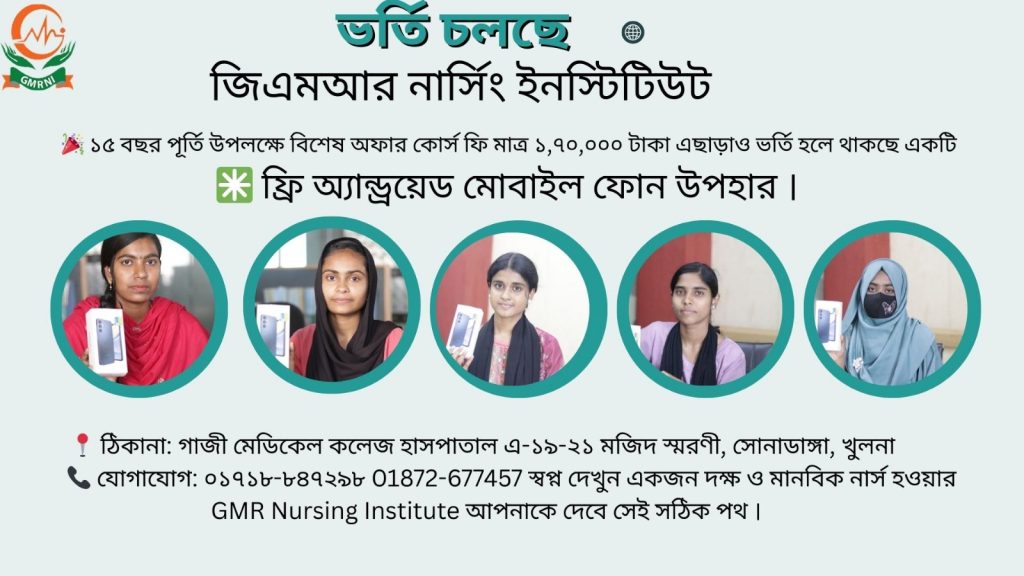 Nursing Admissions 2025-2026 Admissions Notice Nursing Admission 2025-2026 Residential Hostel Facilities Scholarship চেয়ারম্যান স্যারের বার্তা, নার্সিং শিক্ষায় উৎকর্ষতার প্রতিশ্রুতি নিয়ে ২০১০ সালে প্রতিষ্ঠিত খুলনার প্রথম বেসরকারি নার্সিং ইনস্টিটিউট জিএমআর নার্সিং ইনস্টিটিউটে আপনাকে স্বাগতম। এক দশকেরও বেশি সময় ধরে, আমাদের ইনস্টিটিউট সমাজের কল্যাণে অর্থপূর্ণ অবদান রাখার জন্য সহানুভূতিশীল, যোগ্য এবং দক্ষ স্বাস্থ্যসেবা পেশাদারদের গড়ে তোলার জন্য নিবেদিতপ্রাণ। চেয়ারম্যান হিসেবে, আমি আমাদের প্রতিষ্ঠানের অর্জনে অত্যন্ত গর্বিত এবং স্বাস্থ্যসেবা ক্ষেত্রে অর্থপূর্ণ ক্যারিয়ার গড়তে ইচ্ছুক সকল উচ্চাকাঙ্ক্ষী নার্সিং শিক্ষার্থীদের আন্তরিকভাবে স্বাগত জানাই। জিএমআর নার্সিং ইনস্টিটিউটে, আমরা পেশাদার নার্সিং প্রোগ্রামের একটি বিস্তৃত পরিসর অফার করি, যার মধ্যে রয়েছে: নার্সিং বিজ্ঞান এবং মিডওয়াইফারিতে ৩ বছরের ডিপ্লোমা মিডওয়াইফারিতে ৩ বছরের ডিপ্লোমা আমাদের পাঠ্যক্রমটি বাংলাদেশ নার্সিং এবং মিডওয়াইফারি কাউন্সিল (বিএনএমসি) এর মান অনুসারে ডিজাইন করা হয়েছে, যাতে আমাদের শিক্ষার্থীরা জাতীয় প্রয়োজনীয়তা পূরণ করে উচ্চমানের শিক্ষা এবং পেশাদার প্রশিক্ষণ পায়। স্বাস্থ্যসেবা ব্যবস্থায় নার্সদের গুরুত্বপূর্ণ ভূমিকা আমরা সম্পূর্ণরূপে স্বীকার করি। আমাদের নিবেদিতপ্রাণ এবং অভিজ্ঞ অনুষদ সদস্যরা একটি সহায়ক, সুশৃঙ্খল এবং উদ্দীপক শিক্ষার পরিবেশ প্রদানের জন্য অক্লান্ত পরিশ্রম করেন। শক্তিশালী একাডেমিক প্রশিক্ষণের পাশাপাশি, আমরা ব্যবহারিক ক্লিনিকাল অভিজ্ঞতার উপর জোর দিই যাতে শিক্ষার্থীরা আত্মবিশ্বাস এবং পেশাদার দক্ষতা বিকাশ করতে পারে। আমাদের ইনস্টিটিউটের শিক্ষার্থীরা গাজী মেডিকেল কলেজ হাসপাতালে, ৫০০ শয্যাবিশিষ্ট একটি টারশিয়ারি কেয়ার হাসপাতাল, যা আধুনিক চিকিৎসা সুবিধা সম্বলিত। এই অভিজ্ঞতা শিক্ষার্থীদের রোগীর যত্ন এবং ক্লিনিকাল অনুশীলনে বাস্তব অভিজ্ঞতা অর্জনে সক্ষম করে। প্রতিষ্ঠার পর থেকে, হাজার হাজার নার্স জিএমআর নার্সিং ইনস্টিটিউট থেকে স্নাতক হয়েছেন। আজ তারা বাংলাদেশ এবং বিদেশের অনেক দেশে সরকারি এবং স্বনামধন্য বেসরকারি হাসপাতালে স্বতন্ত্রভাবে সেবা প্রদান করছেন। প্রতি বছর, আমরা স্বীকার করি: নার্সিং বিজ্ঞান ও ধাত্রীবিদ্যায় ডিপ্লোমা ৭৫ জন শিক্ষার্থী মিডওয়াইফারিতে ডিপ্লোমা ৩০ জন শিক্ষার্থী নার্সিং শিক্ষাকে সহজলভ্য এবং সাশ্রয়ী মূল্যের করে তুলতে আমরা প্রতিশ্রুতিবদ্ধ। আমাদের ইনস্টিটিউট যুক্তিসঙ্গত মূল্যে শিক্ষা প্রদান করে এবং আমাদের ৫% শিক্ষার্থী যোগ্যতা এবং প্রয়োজনের ভিত্তিতে সম্পূর্ণ বিনামূল্যে বৃত্তি পায়। জিএমআর নার্সিং ইনস্টিটিউটে, আমরা বিশ্বাস করি যে নার্সিং কেবল এ