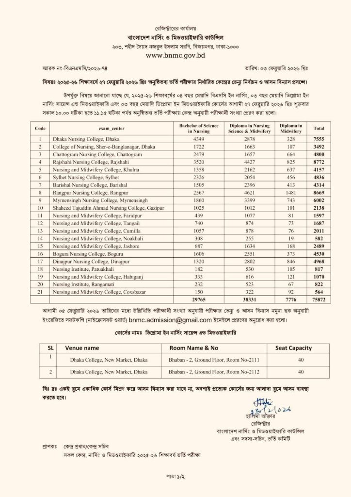 BNMC Nursing and Midwifery Admission Students List 2025-2026